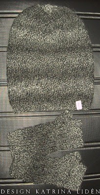 Dessa charmiga saker – mössa och vantar – är stickad i huvudsak i moss-stickning. Först en vanlig kort mudd (1 r, 1 a, *) sen övergår det till moss-stickning.