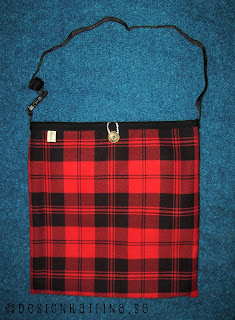 Det röd/svarta tyget är ett resttyg och jag har använt svart lakansväv till fodertyg. En liten enkel ficka på insidan och band på kanten av väskan/påsen. En knapp fick bli en dekorativ stängning.