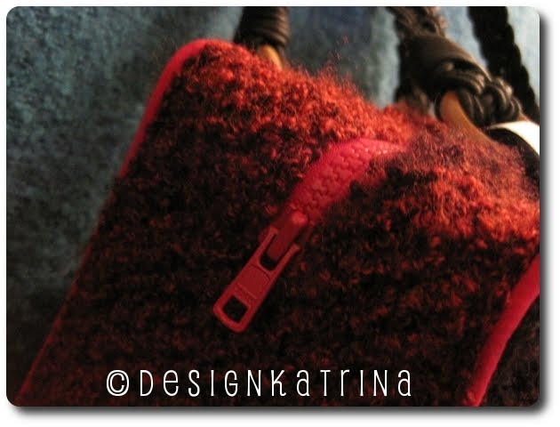 Dragkedja till öppningen av väskan är ju ett måste. Här har jag en röd dragkedja. För att tillägga – jag stickade fortfarande på snedden där jag öppnade upp för dragkedjan. Det kan man se på bilden för den vana stickaren. Det krävdes lite tankeverksamhet så jag satte öppningen på rätt plats!