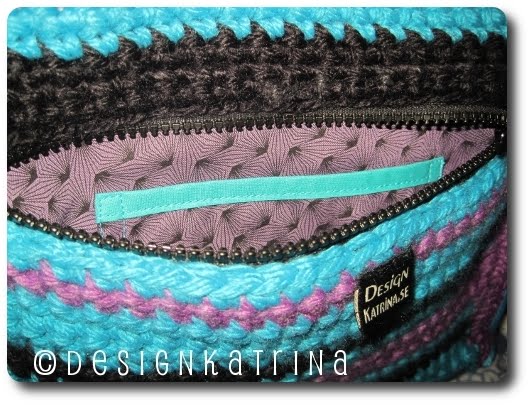 Den är virkad i garnet Molly och liknar en väska jag gjorde innan jul fast i andra färger. Det är alltså den andra virkade väskan jag har gjort! Insidan är sydd (på symaskin) i ett lila tyg.