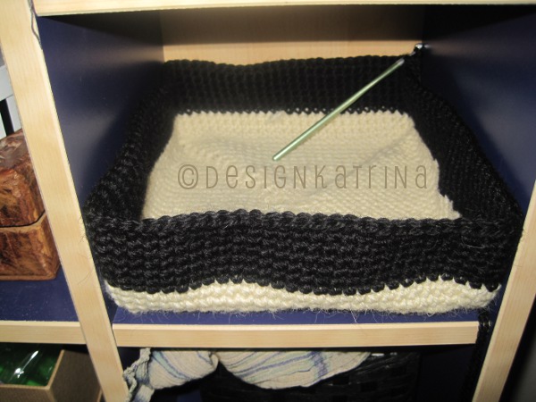 Min plan är att göra askar i några olika färger i botten och så den färgen går upp 2 cm på sidorna. Därefter byter jag garn till svart. På så sätt kan jag dela in sakerna i smink-grejer, hår-grejer, osv. Lättare att se på de olika färgerna vad som bör ligga däri!