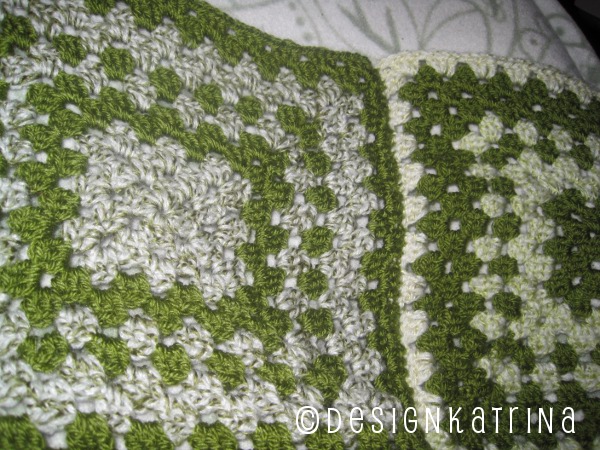 Jag använder två akrylgarner – Big Verona. Ett melerat i ljust till svagt mörkt grönt samt ett i enfärgat grönt. Jag gör rutorna mycket större än vad filmens poncho hade, tror det blir bäst.
