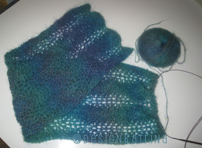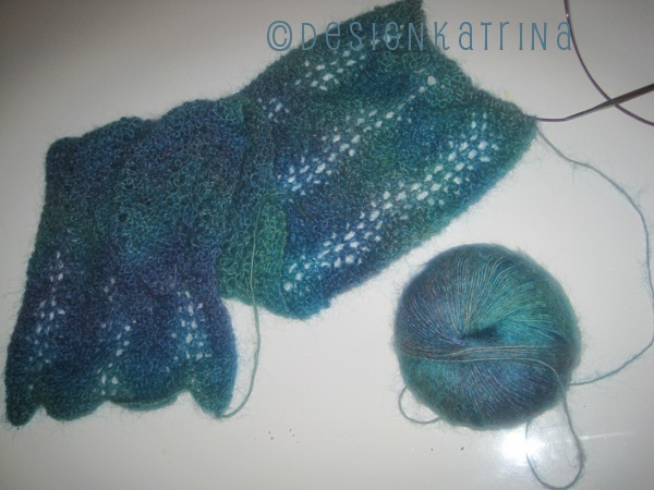 Garnet är ett fullkomligt underbart mohair-garn som lämpar sig utmärkt till mönstret. Helt rätta färger för en påfågelsmönster-halsduk, och helt rätta färger till mig. Kan bli vårens halsduk! Den kommer att bli ca 160 cm lång.