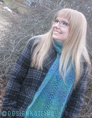 Den är svagt melerat i riktiga Kattis-färger som går från lila till turkost till svagt grönt. Mönstret är påfågelmönster, det hittade jag åt i en tidning i 2009.