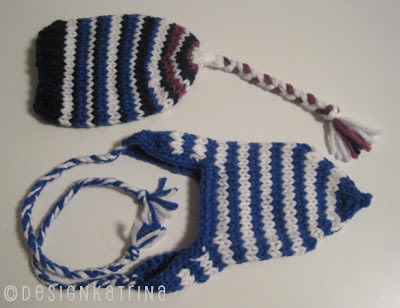 Häromdan kom sambon hem o frågade om jag kunde göra sån där en snabb mössa, som han då kunde ge bort nån dag efter till kompisens barn. Jag hade garn kvar i just de färger han ville ha. Dessutom hade jag lite rester av andra färger. Så det blev inte bara en mössa, det blev två mössor. Jag har gjort varianter på grundmönstret här, en med öronlappar på 7 m bred.