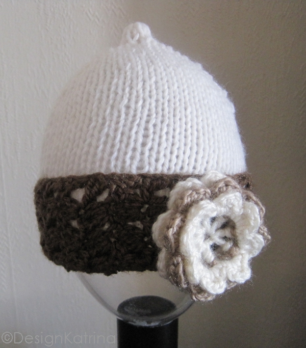 Det blev en varm o härlig mössa med en gullig virkad kant och blomma. Det blev mycket bättre än jag trodde faktiskt! Så jag är helnöjd. Mössan är då vit med en virkad brun kant med blomma.
