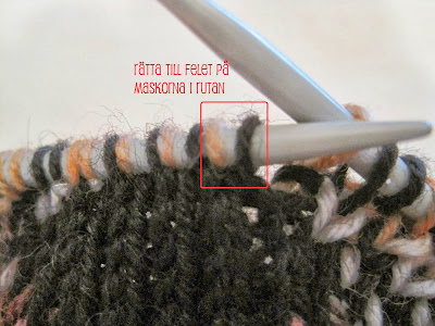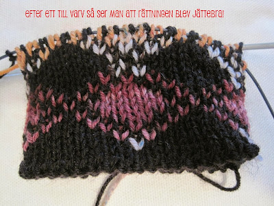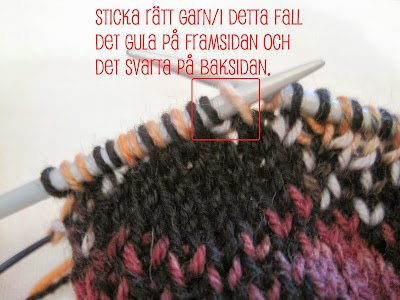 Har man stickat fel i förra varvet, stickat med fel nystan, går det att ordna till utan att repa upp allt. Här har jag stickat fel, jag skulle haft gul på framsidan och svart på baksidan.