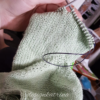Jag har gjort en tillfällig virkad uppläggning för ärmens axel för att ta resten av ärmarna sist o då få ut så mycket som möjligt av garnet. Så axlarna är på så sätt stickade med kroppen. Ärmarna kommer jag att sticka samtidigt så jag får lika mycket på båda ärmar tills garnet nästan tar slut. Då får vi se hur långa ärmarna blir.