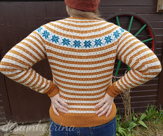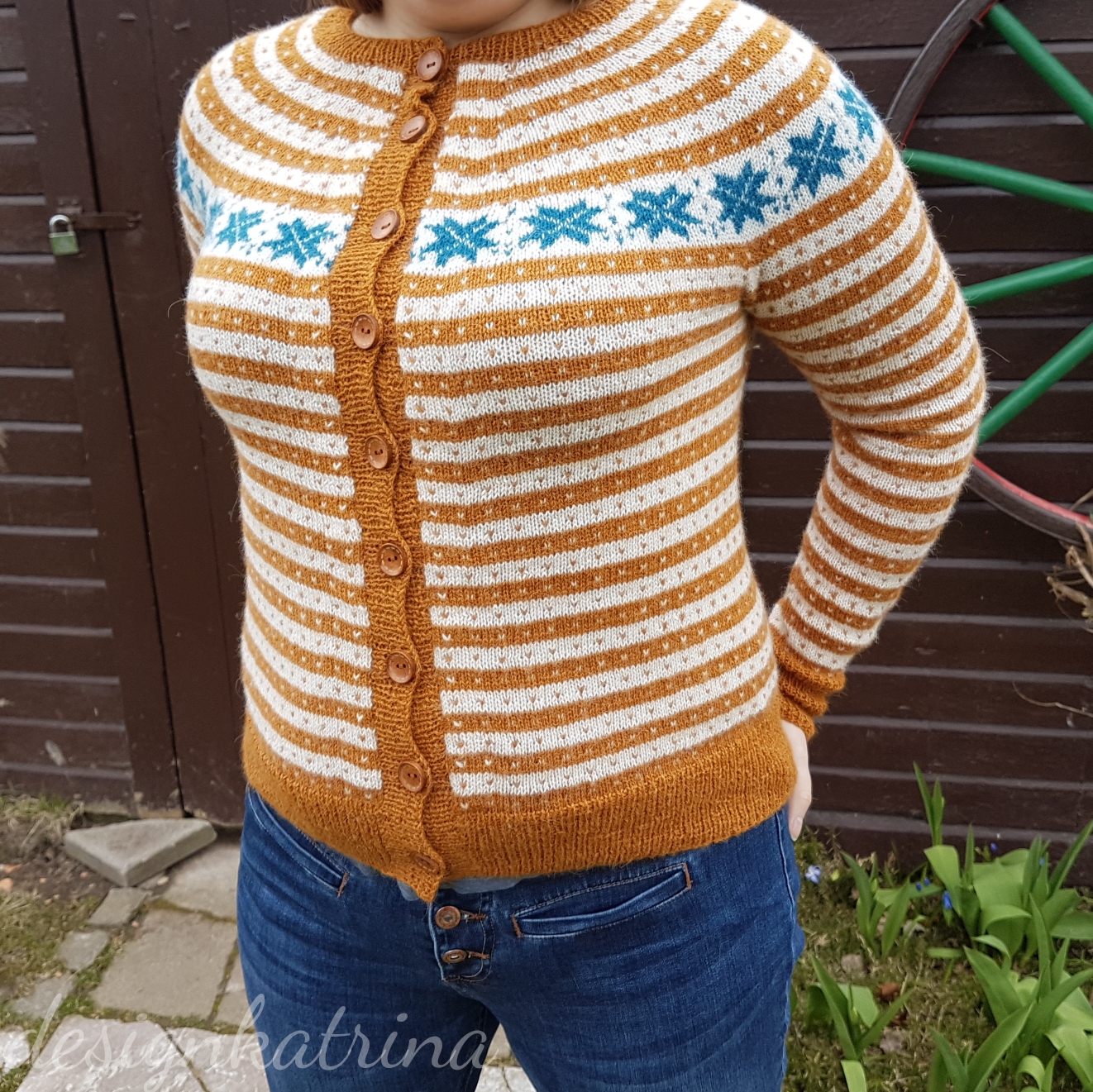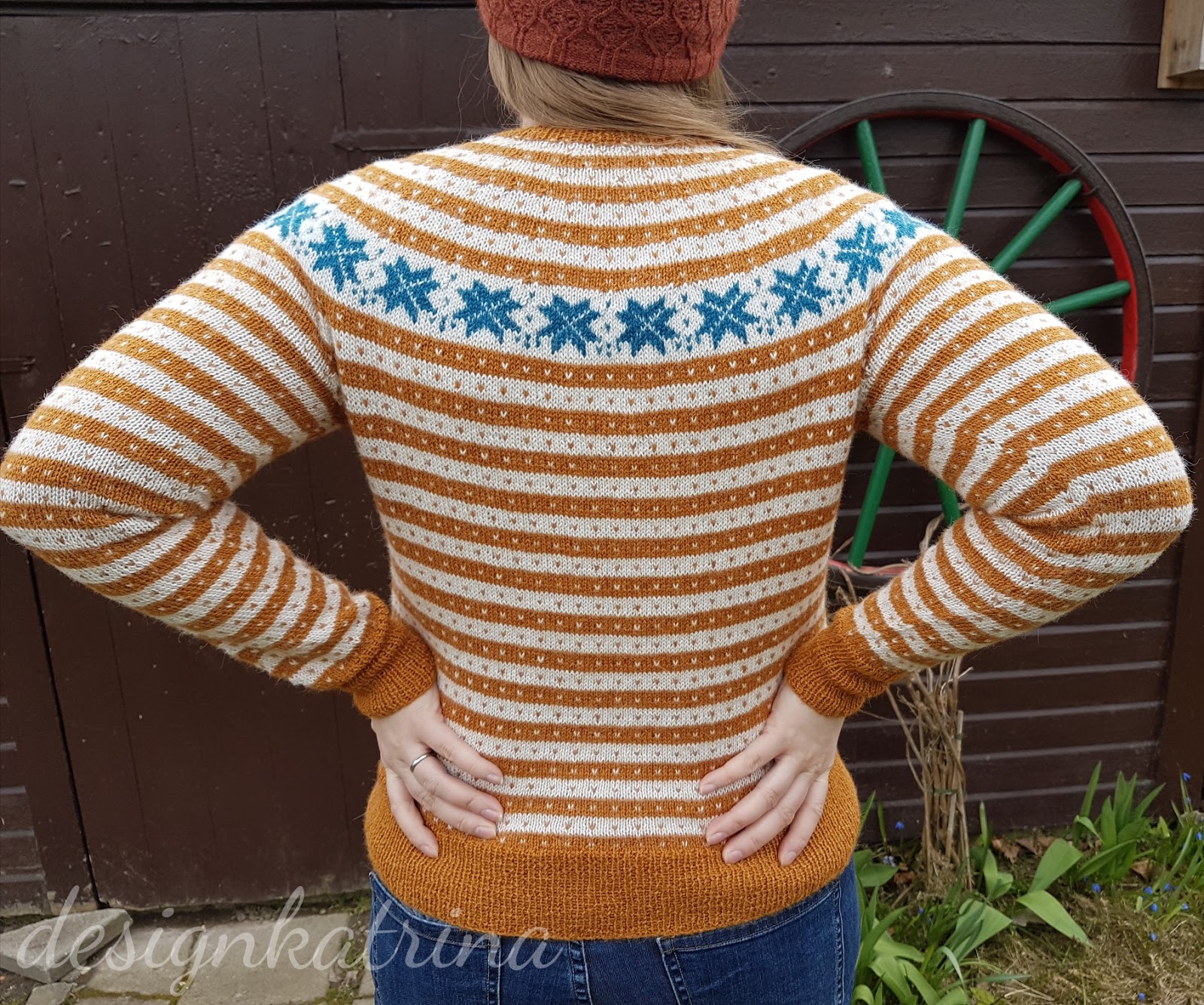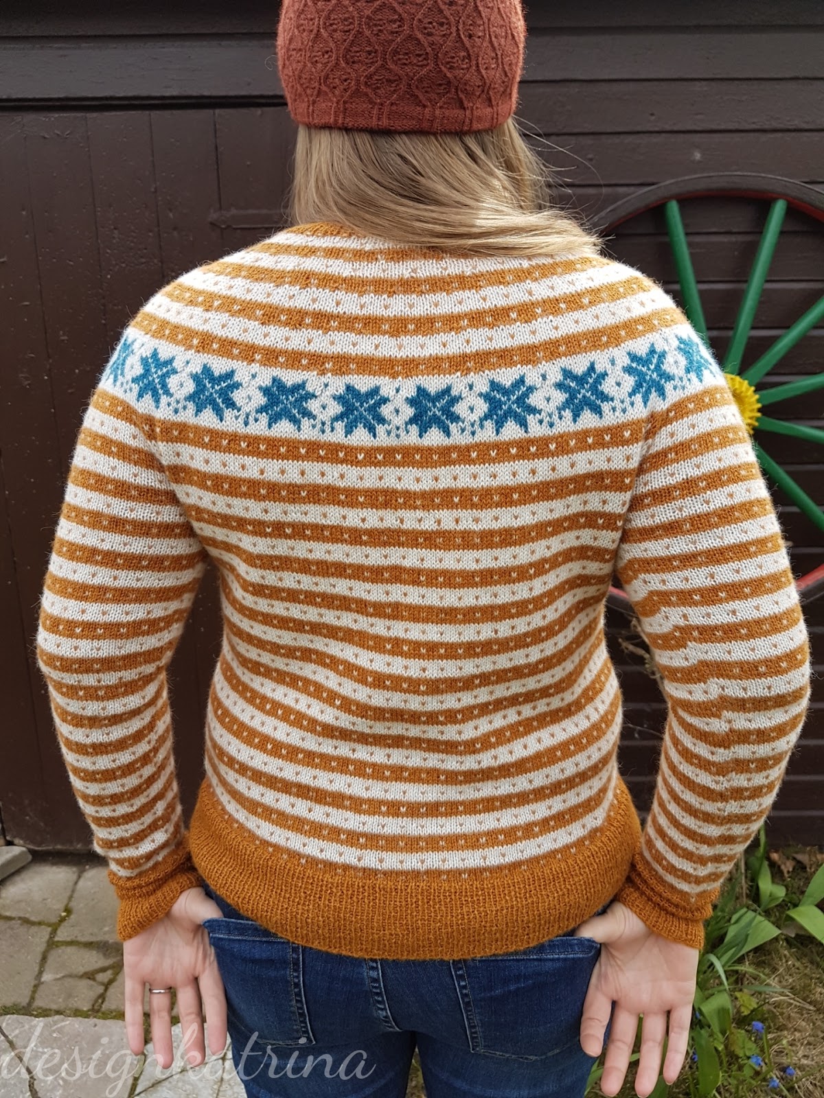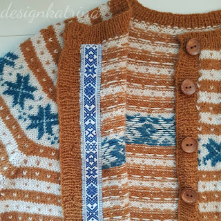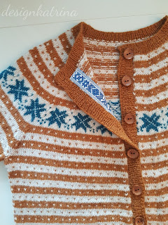 Det här är en kofta som jag fullständigt älskar och är glad för att jag fått klar. Jag är glad för att jag vågade ta andra färger än “de vanliga” grön/blå som brukar bli mitt val vid koftstickning. Jag gillar rostfärger, så valet föll på den härligt rostiga orange färgen. Resten av färgvalet hjälpte Garntua till med, den vita som heter Kitt blev så bra till och petrol till stjärnorna blev perfekt.