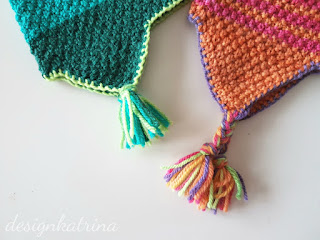 Med garnet Karamell blir det färgglada mössor, osvsett om man stickar ränder eller inte. Det har varit så roligt att skapa detta mönster, det är också dotterns favoritmössa. Hon har haft den ett tag nu och den sitter på riktigt bra. Gjorde också en minimössa till gosedjuret, gulligt.