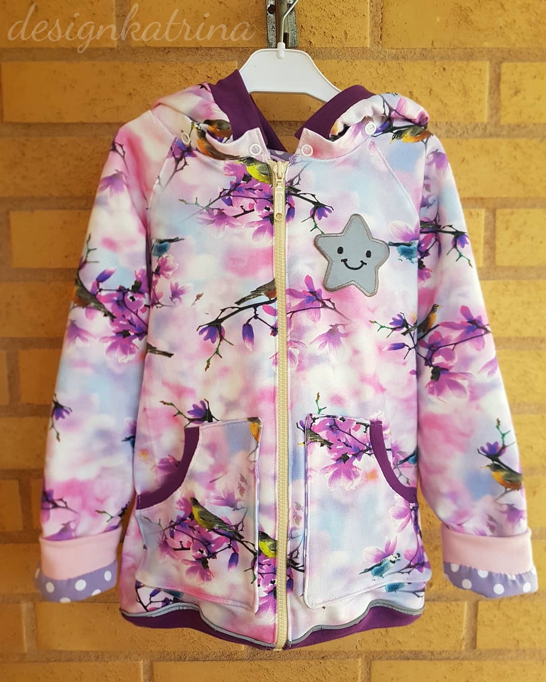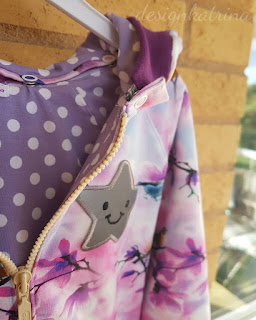 Det rosa tyget med fåglar är ett sweatshirttyg. Det lila-prickiga tyget är jerseytyg. Sen har vi reflexstjärnan, dragkedja, muddtyg, tryckknappar. Det jag hade hemma var passpoalbandet med reflex.