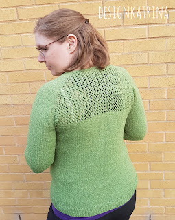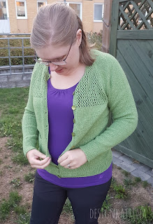Så fin den blev! Förstår att du gillar den jättemycket! Jag är verkligen förtjust i den gröna färgen, och mönstret är jättefint! Fint med matchande knappar också:) Bra tajming också till när det börjar bli lite kyligare i luften. Sommarens högsommarvärmen uppmuntrade inte till stickning, så jag förstår att du inte var så sugen på att sticka på den då. Men den var väl värd att vänta på:)