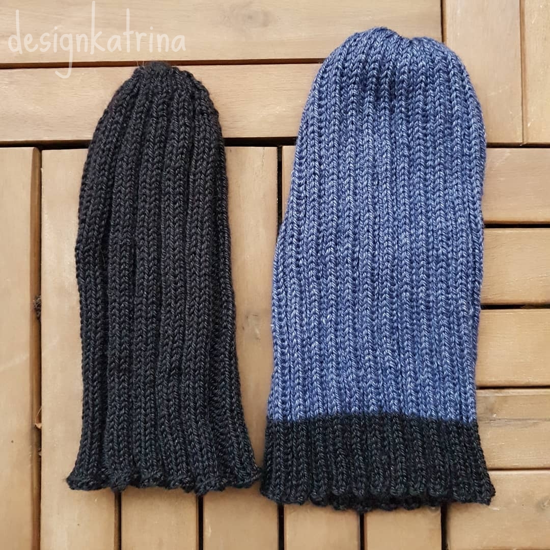 Jag har också stickat ett par mössor till julklapp, mörka skulle de va. Så jag stickade enkel ribbstickning på båda mössorna, eget hittepå. Garnet var ett Onion Organic wool- nettle garn. Väldigt mjukt och mysigt att sticka med. Detta var ett av de projekt där jag köpte garn, för jag verkade inte ha något mörkt garn som passade.