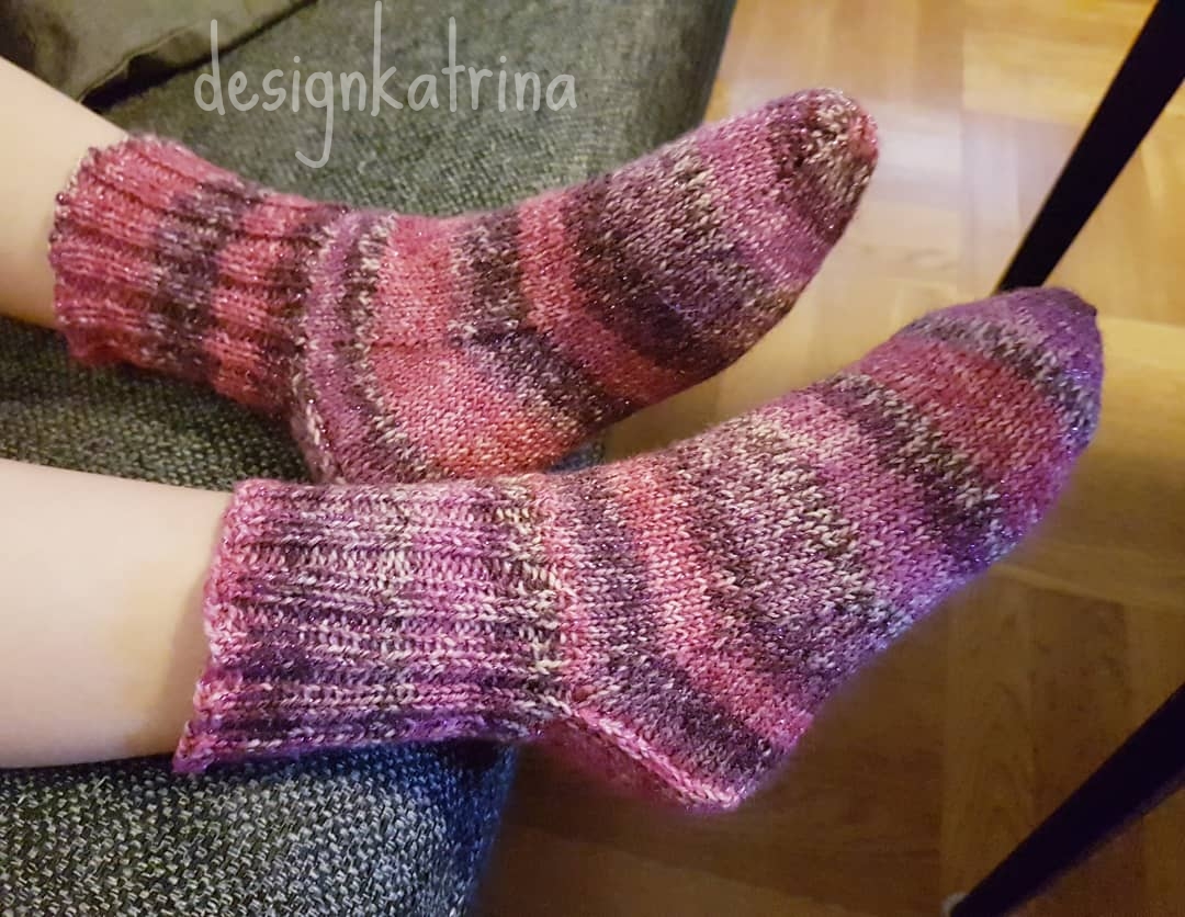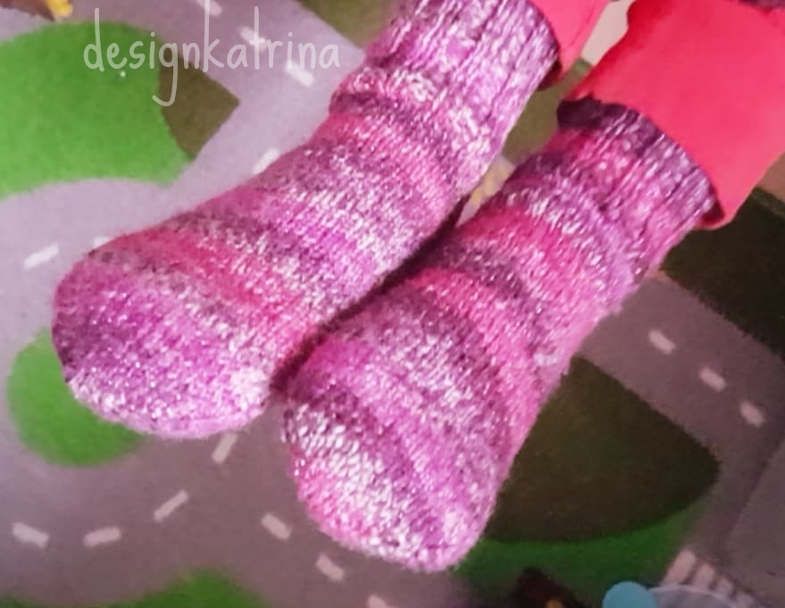 Garnet, ja, det var ett sockgarn som dottern hittade på mataffären. Det är ju glittrigt, rosa och lila. Den bästa sorten för en 5-åring som inte kan få nog av glitter! Så nu har hon extra sockor till vinterskorna igen.