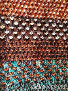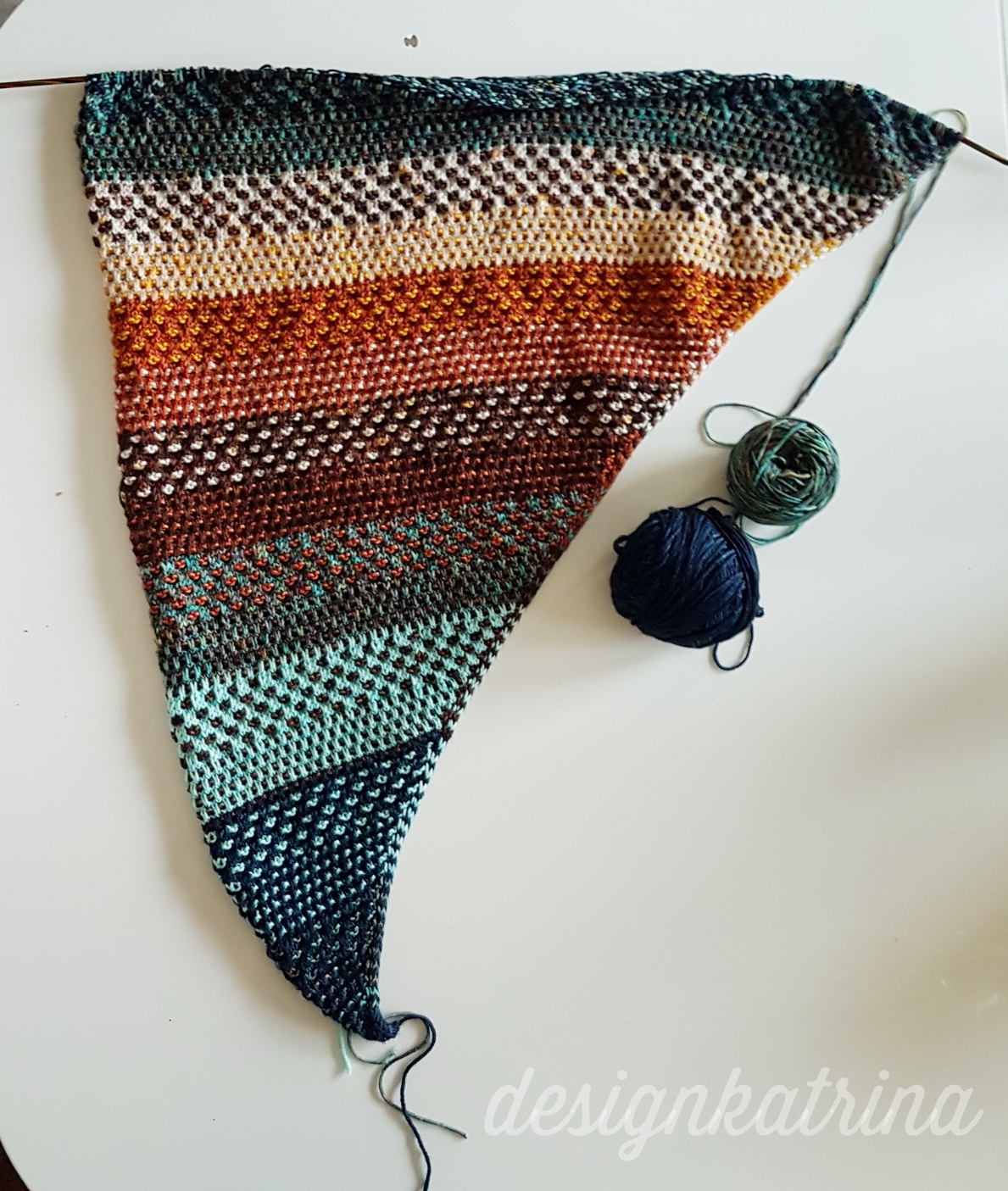 Eftersom det är en sjal så kollade jag inte stickfastheten med ett stickprov först. Så därför stickar jag fler repetitioner av mönstret (stickade lite för hårt) men det är helt okej med mig! Den är så underbar att sticka. Älskar att mixa färger också och nu har jag chans till flera färgmixer. Fortsättning följer på denna!