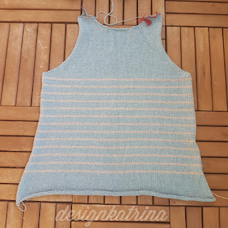 De ändringar jag gjort är att höja nacken och ha något bredare axelband. Nu är framsidan kvar att sticka och de enda ändringar som blir där är något bredare axelband. Sen funderar jag på om I-cord kanter skulle bli snyggare än de ”råa” kanterna i mönstret. Jag vet inte än, jag får testa och se hur det ter sig. Fortsättning följer!