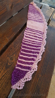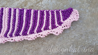Dottern ville också ha en (mindre) sjal med uddkant i rosa och lila. Så där valde hon Tanja Metallic från Falkgarn, från stashen. Det är ju glittrigt, kan inte bli bättre! Denna gick rekordfort att sticka, tjockt garn och 20 m som mest. Uddkant här improviserade jag fram, hur jag gjort står på projektsidan på Ravelry.