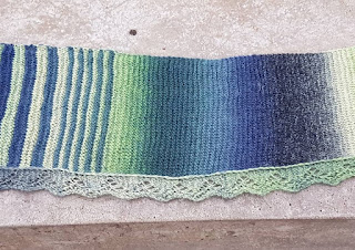 Jag saknade en sjal i garderoben som är smal och lång som man kan vira flera varv runt halsen. Så jag stickade mig en i ett garn från stashen, grönt melerat Drops Delight. Inte för tjockt utan ett lagomt garn till en sjal.
